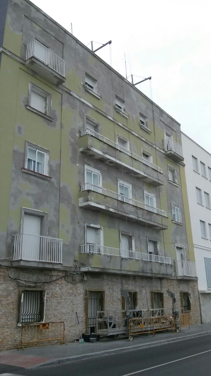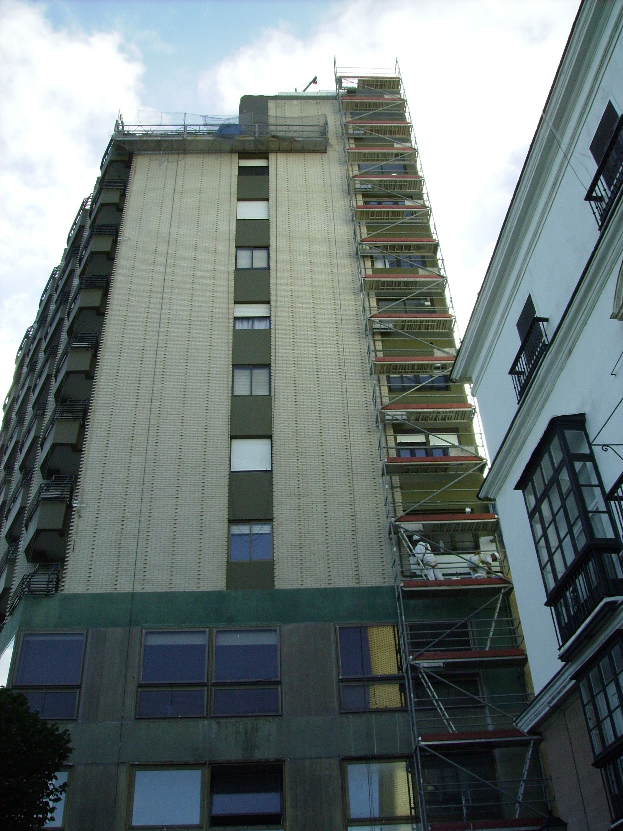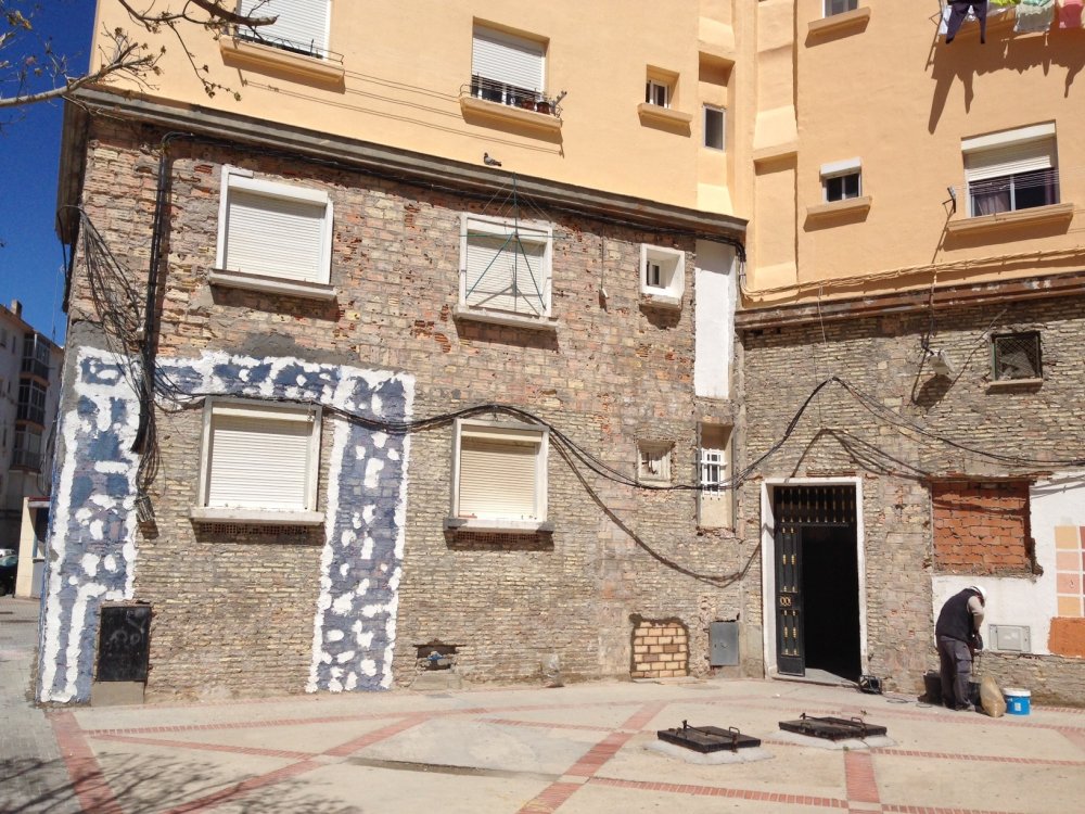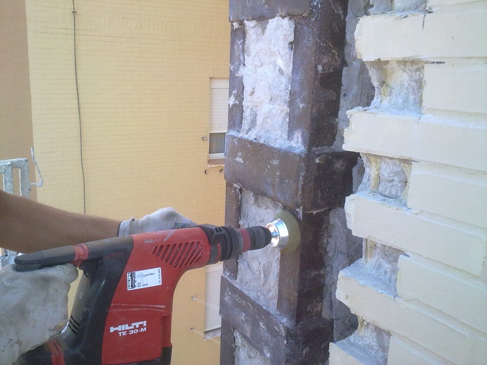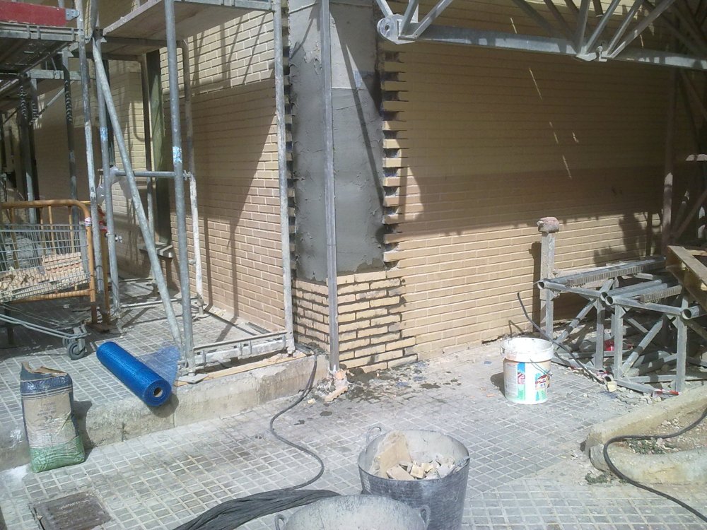 Reparación de elementos estructurales en pilares y forjados del edificio formado por: demolición del emparchado de ladrillo visto, tratamiento de las estructuras con morteros de SIKA, enfoscados y formación del nuevo emparchado de ladrillo visto.